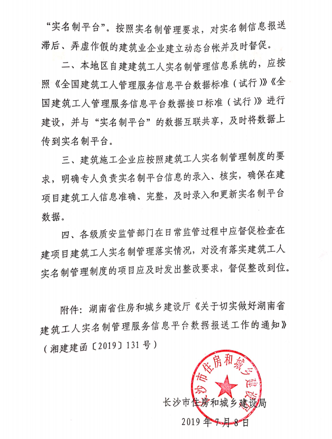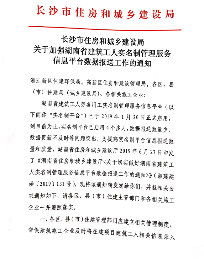 關于加強湖南省建筑工人實名制管理服務信息平臺數據報送工作的通知